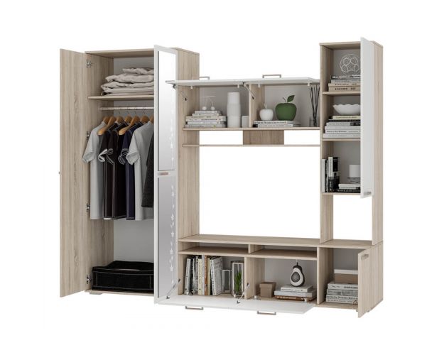 Компактный гарнитур «Лукас» – это функциональная стилизованная модель с простыми геометрическими формами и множеством полезного пространства. Контрастное сочетание фасадов белого цвета с древесной фактурой дуб сонома, а также отделка зеркалами станут ярким акцентом любого интерьера.