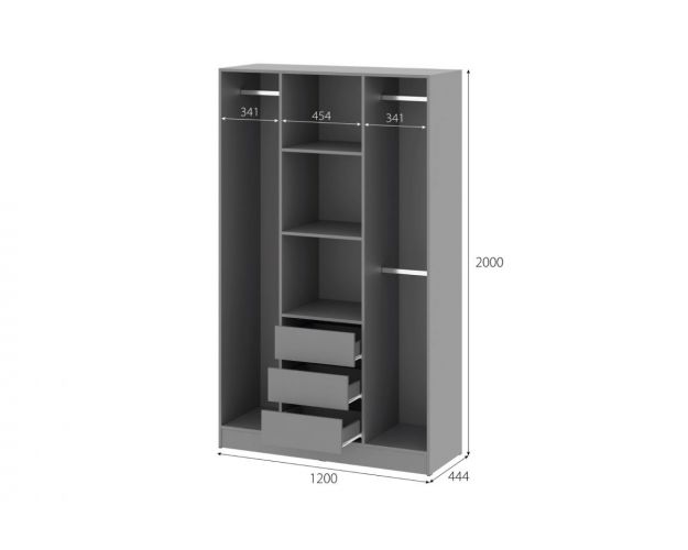 Не смотря на то, что шкаф имеет две створки, его внутреннее обустройство состоит из трех секций с тремя системами хранения. Две боковые секции предназначены для размещения одежды на штангах. Причем одна из них для длиной, а вторая для двух уровней короткой одежды. Центральная секция в верхней части оснащена полочным пространством, а в нижней - тремя выкатными ящиками.