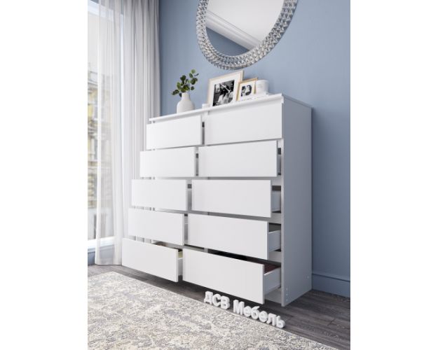 Комод Мори МК 1200.10- Комод в стиле минимализма с 10 выдвижными ящиками высотой 123 см. Корпус и фасады выполнены из ЛДСП. Для выдвижения ящиков использованы роликовые направляющие. Комод разделен на две секции перегородками.